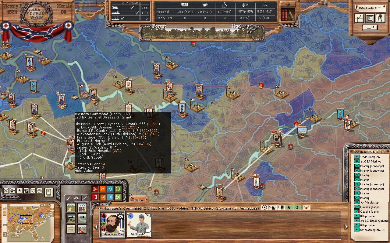charlesonmission wrote:The other large campaign by the Union this year has been the Vicksburg/Jackson, New Orleans, Mobile, Atlanta, and Montgomery actions. In the end, none of these objective locations and strategic places came that close to falling into the Union’s hands. The reason isn’t that the Union didn’t have the forces, they do. However, if you remember my original posts at the beginning of the AAR, you will know that I put a high value of contesting the Mississippi River. I’m currently reading the book Vicksburg 1863 and am really learning to have a better understanding of the significance of the Mississippi River. This was something that Grant saw early on historically. Since I control with coastal artillery the positions of Dyer TN, Memphis TN, Vicksburg MS, and New Orleans LA, a movement that bypasses these will run into supply problems within several turns. The Union has taken huge supply hits on many of these campaigns. I think the Union thought that it would find the interior lightly defended. However, a sole division that is well supplied, well lead, and dug in will hold off superior forces at least once. And this is the essential point, the Union can’t wait around to attack again as suddenly supply starts to run out.