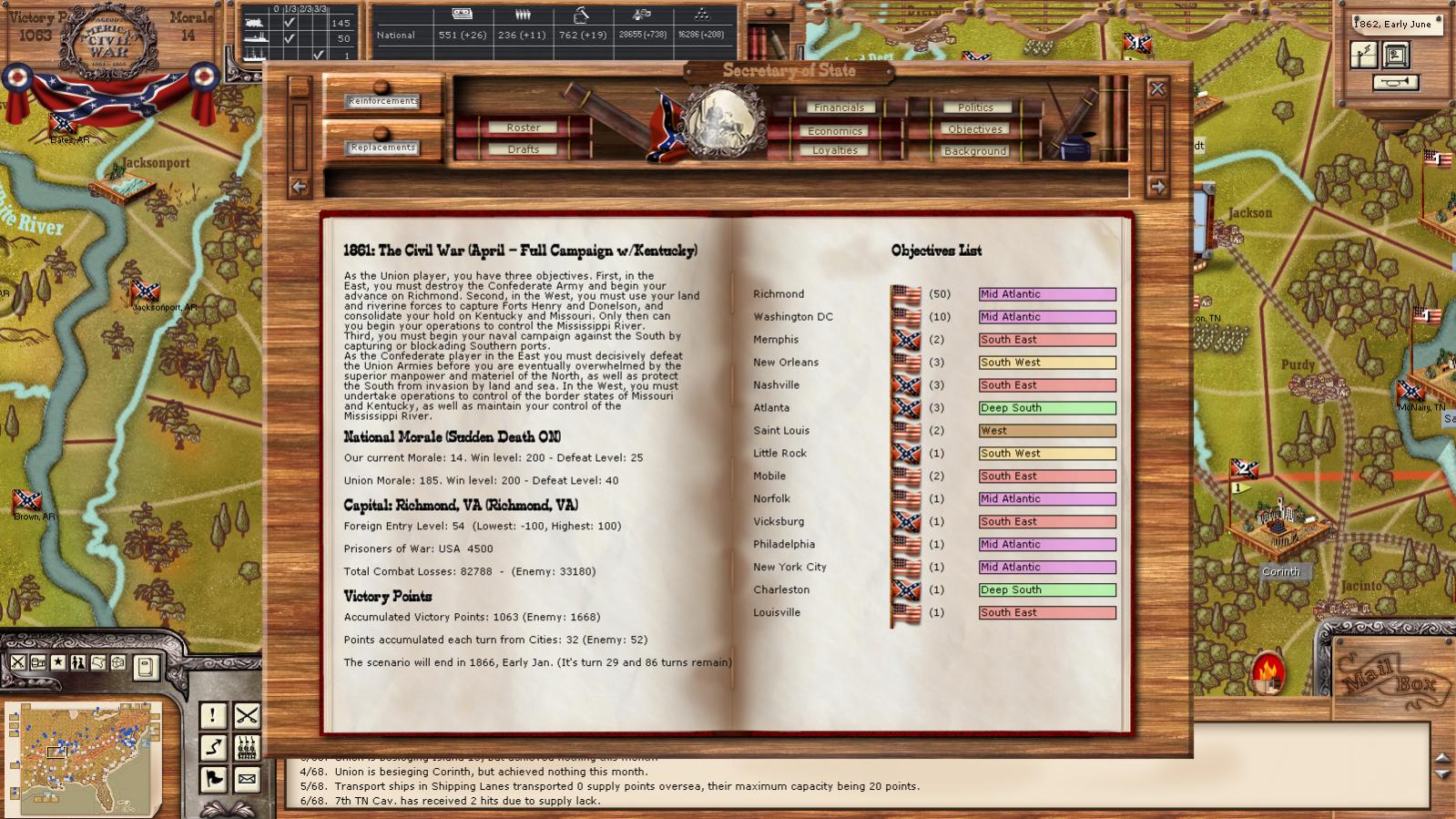 The Missouri situation is even grimmer for the Union. The rebs own ALL of Missouri south of the big river, even St. Louis, although the forces might be evenly matched otherwise. Sibley has even taken the Rockies, and Arizona flies the Stars and Bars. These are big gains, worth WS, GS, conscripts, new units and VPs.