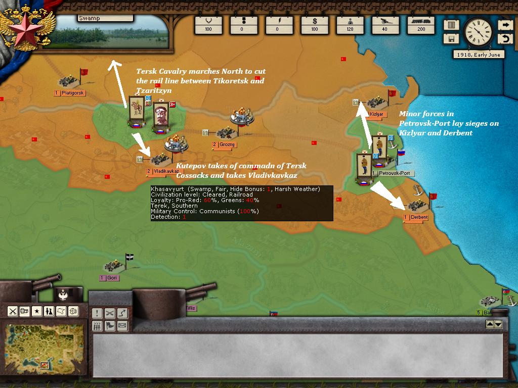 4. You must be well prepared for an attempt of a breakthrough or even a successful breakthrough. Try limiting the enemy in choices. For example: The most vulnerable position planned in the encirclement of Sorokin was Salsk, where most probably the Reds would be headed since sound hopes would be only for the Kuban cavalry brigade protecting this sector which left it barely protected. In case of a successful breakthrough here, the Reds would have rather limited abilities to protect Kuban and would have to go either to the Caucasian or Tzaritzyn theatre, in either case leaving Ekaterinodar unprotected and the Taman army unaided.