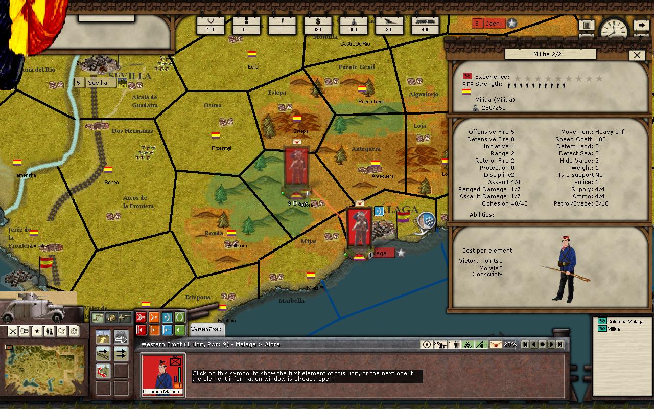 My idea is to begin with a couple of troops. The Nacionalist will have a stack in Sevilla and will move towards enemy defended regions trying to achieve Victory Conditions. In this way i will test the part of creating new Factions, new units, and testing the map also.