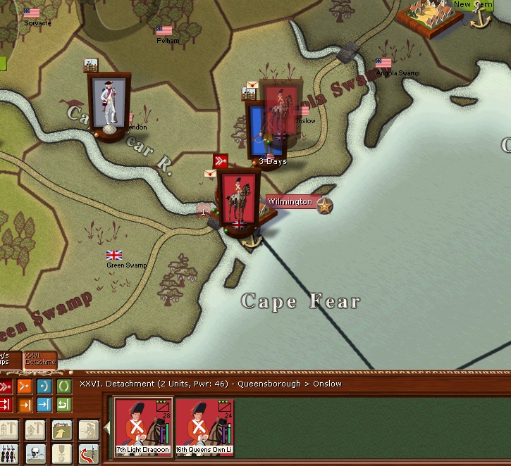 The main actions are on the cape fear river,The 17th/16th Dragoons have sallied out of Wilmington to engage some rebel militia but the rebels slip away into the wilderness.Colonel Courtland Skinner leads a brigade out of Wilmington and inflicts a defeat of a regiment of French infantry.