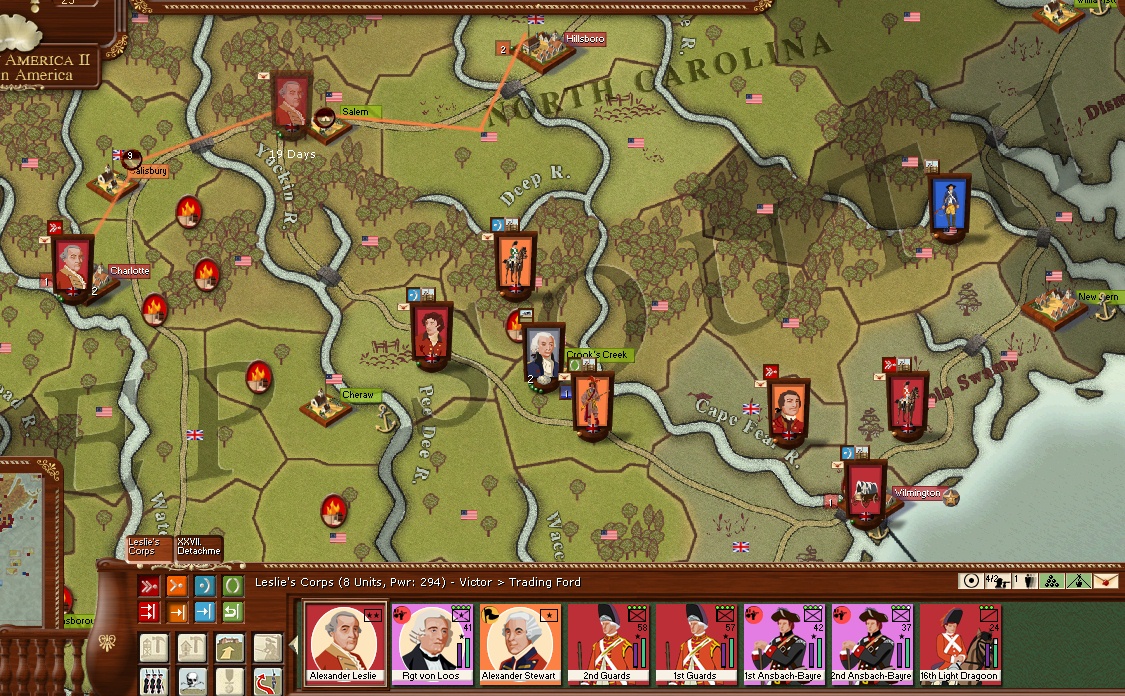 The opposing armies are all in winter quarters in most of the colonies,Cornwallis and Leslie are getting ready to march and destroy Lazun who is camped somewhere near Wilmington,Sir Charles Grey is holding Wilmington from possible attack by Lazun and his French army who i hope are feeling the effects of low supply.