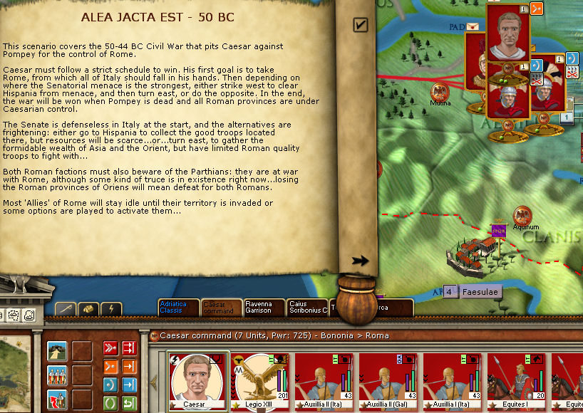 After fiddling around with the game for a few days, I decided to do an AAR. I’ll be playing Caesar whose quote “Alea Jacta Est” (The die is cast) is the inspiration for the games title. The AI will be handling Pompey and the Senate.