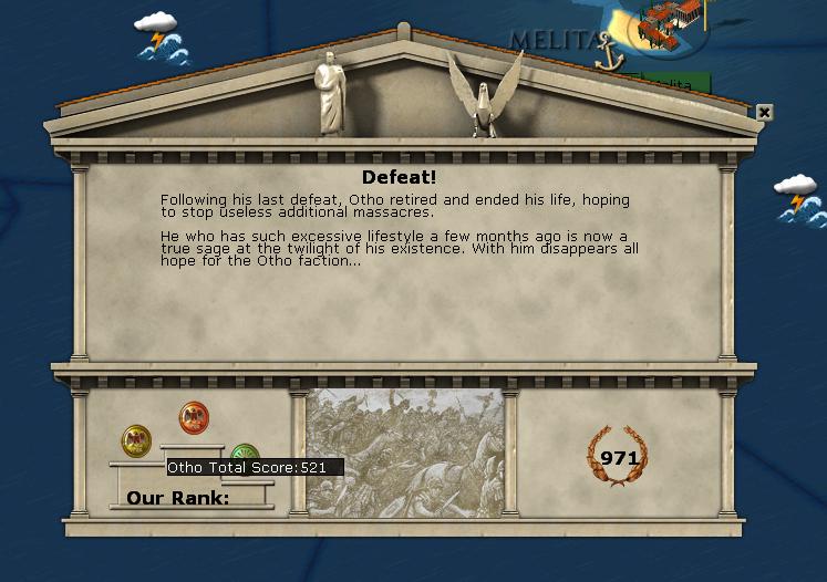 I think it was reported already, but when I played Albinus in the Severus-scenario, I won on turn 8 when taking Rome. No battle agains anyone except Didius. Ok, moral skyrocketet to 186, but still - this shouldn't be.