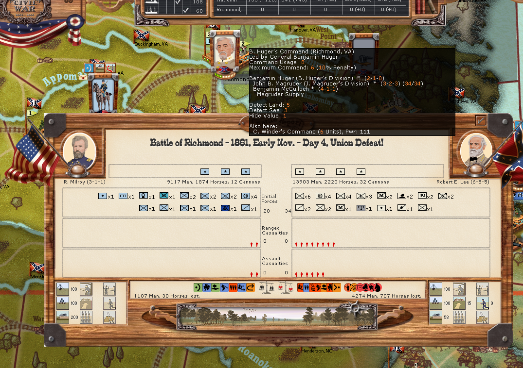 Here I had Richmond sieged and then Huger comes and attacks. Attached is the battle result.