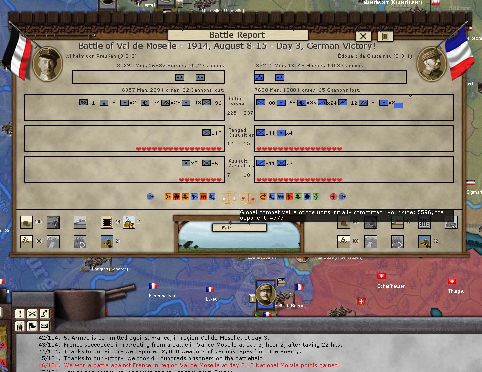 So far, action has been limited to a few active armies in the initial turn. German I, II, and III armies advanced into Belgium & the Ardennes. II Army has laid siege to Liege, and is ordering up heavy bombardments to silence the forts out-dated guns. On the southern end of the border, the French Premiere Army demolished my small Corps defending the region and retook Mulhouse (which lead to great cheering and a +5 NM boost in France).