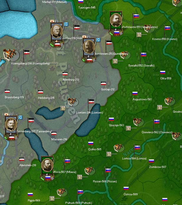What I'm leaning toward now may prove a better and more flexible solution is to have the Germans be able to play an event (or map decision) one time during the game. When it is played, all Russian forces in German territory that turn have their leaders immediately set to inactive and lose a healthy amount of cohesion (maybe like -50% cohesion). I like the dynamics of this solution, as it means that the Centrals player has a lot more control over using it to their benefit, and may simply carry it over to later in the game if the Russians avoid Prussia. The Russians are also given a good incentive to just go ahead and take the risk, since it's better to risk losing troops in 1st and 2nd Army against an undermanned 8th Army than to risk much, much heavier losses if they get hit with th event later and the Germans have 2 or 3 armies on hand to dish out even more catastrophic losses.