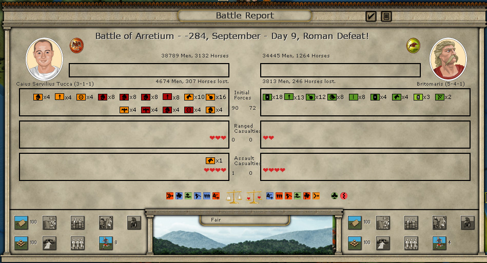 Had those been considered Roman victories the Morale gains (which tend to be based on element elimination) would have been huge! I was robbed here, IMO. Still, thanks to Ariminium I'm up to 85, which is only bad; much better then the completely awful 70 it was just a few turns ago.