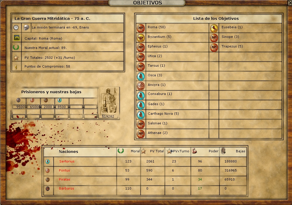 Bueno, aunque fracasé estrepitosamente en Hispania, los puntos contra el Ponto me permitieron ganar la partida, pero me quedó el sinsabor de saber que había sido derrotado con MAYUSCULAS en el campo de batalla por uno de los bandos en liza.