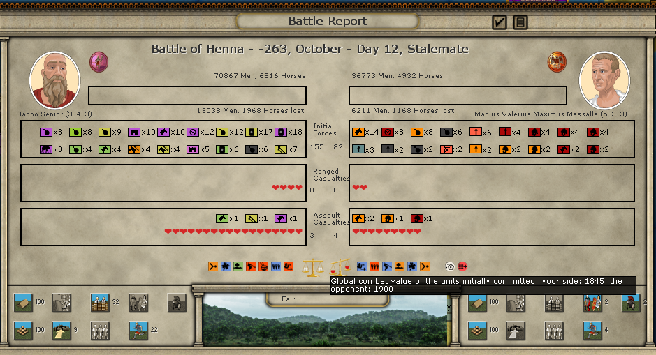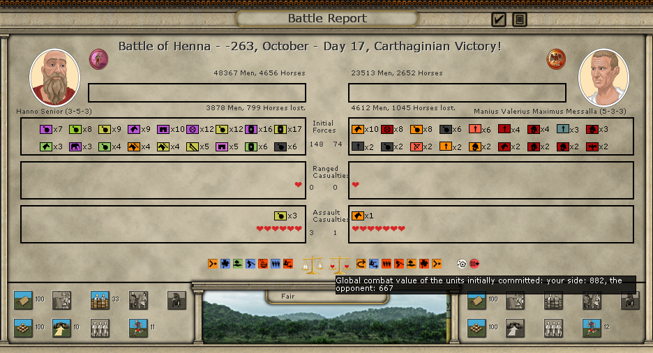 Here are the battle results. It seems the Roman commander has a trait that allows him to deploy extra troops, which in a limited frontage situation like in the mountains in Messana can be very helpful:
