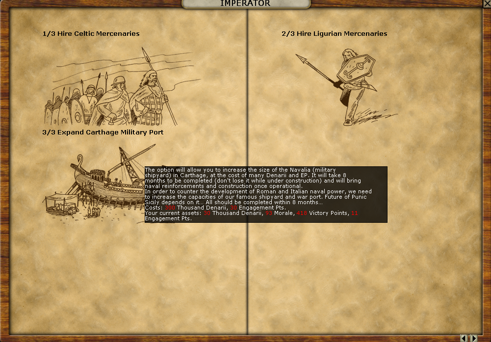 The Romans are started building another port in Ostia and this triggered a new option for me to expand the port in Carthage. It will be hard to pay for it thought: it costs 300 denarii, and 30 EPs! I constantly need money to replace my losses so I probably won't be able to afford it until next tax season at best. Also, since I've been recruiting mercenaries, I'm nowhere near the required EPs to pay for it.