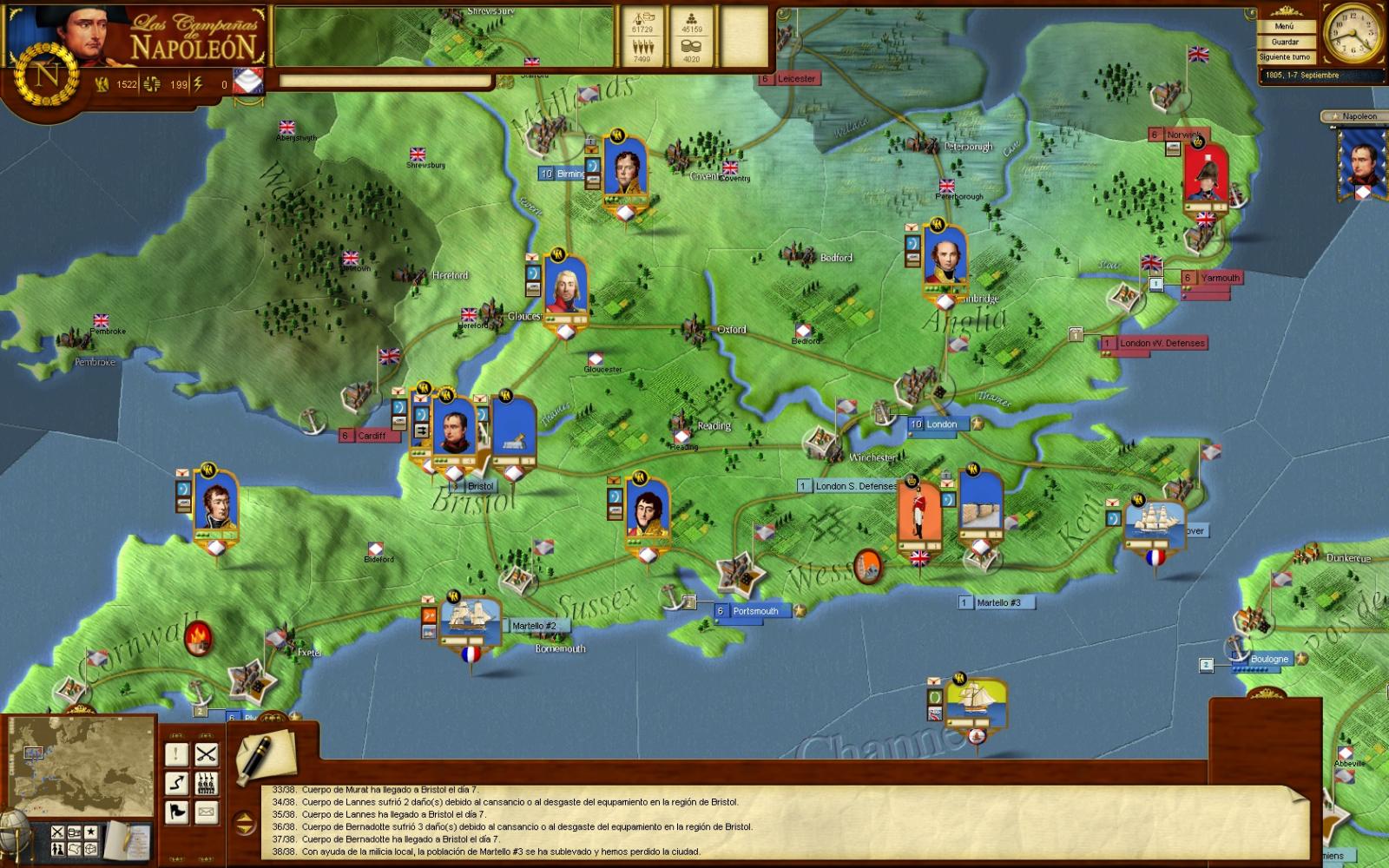 Por noticias que se tienen del Cuartel General de S.M. el Emperador, el pasado día 1 del presente las autoridades inglesas de la ciudad de Bristol han rendido sus fuerzas y han entregado las llaves de la ciudad al invasor tras una escaramuza con las escasas fuerzas que defendían la ciudad y en la cual fueron exterminados tres regimientos de dragones. Con esta conquista se afianza el dominio francés sobre la zona occidental, incomunicando la única ciudad importante que le queda al enemigo, Plymouth, hacia donde se dirigirá sin duda el próximo movimiento de la Grande Armée.