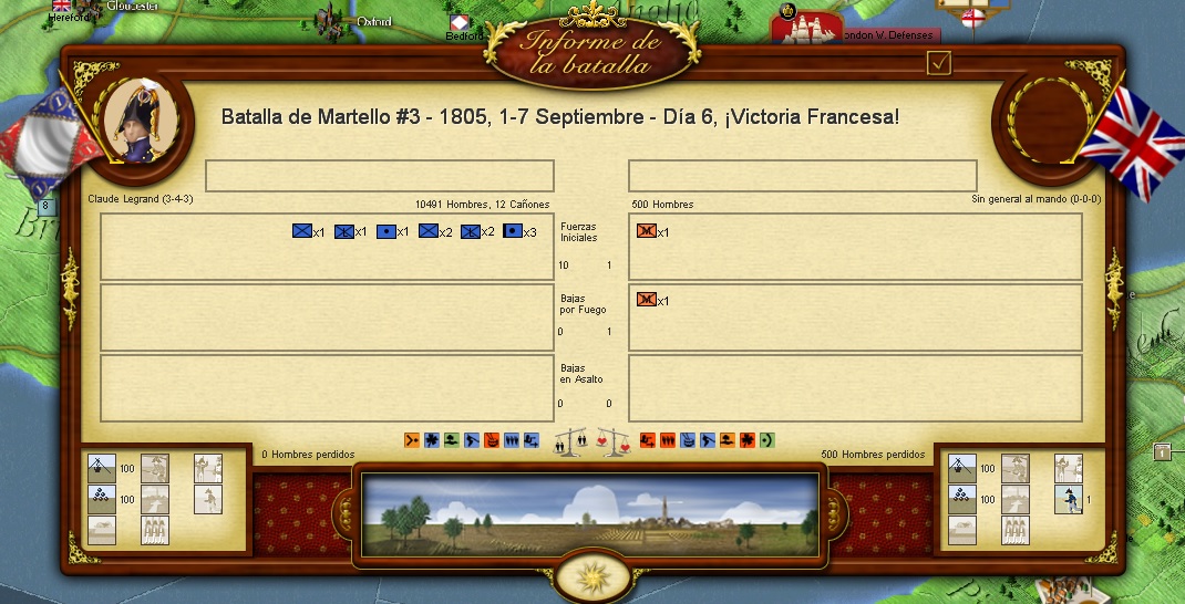 Viendo ese mapa final de Inglaterra llena color azul y con mariscales napoleónicos llegando hasta Escocia, queda claro que lo de "batalla no decisiva" del resultado del escenario no es más que "propaganda" británica... Menuda paliza... ;)