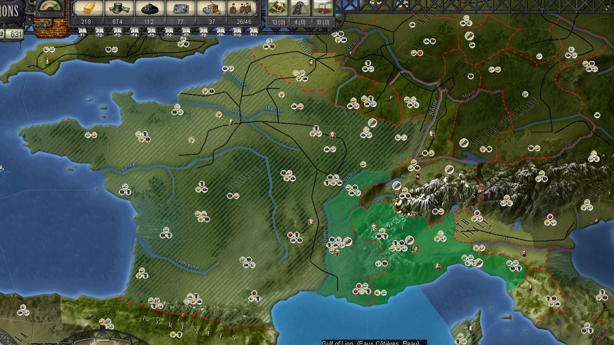 Another curiosity. I'm playing Piemont-Sardaigne but I just received a message which was obviously not intended to me but to France. The message congratulated me for my nearly completed objective of the largest army in the world. The message (looking like a newspaper page) was accompany by a lovely music: La Marseillaise (French Anthem).