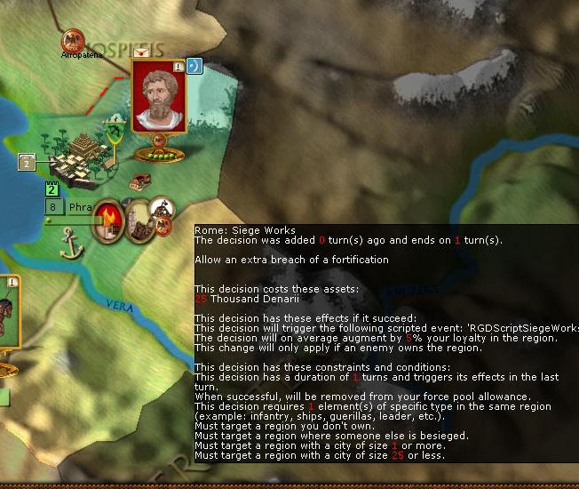 Severus has arrived in Phraaspa and begins to lay siege to it. We decide to use one of our "Siegeworks" regional decisions, hopefully it will speed up the siege. Severus doesn't want to get stuck outside the city for the whole winter.