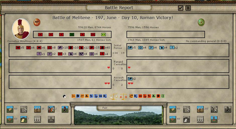Candidus was attacked again at Nicephorium by a large Parthian force but managed to retreat to Apamea. He did manage to inflict a significant amount of damage to his attacker though. He is ordered to dig in and rest for the turn.