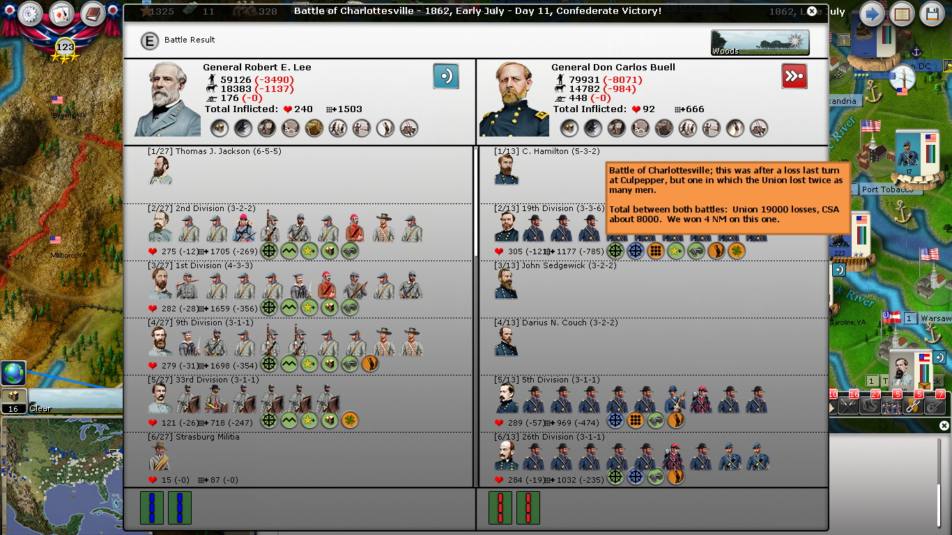 He followed that up, though, with an all-in move to Charlottesville. This time, Bobby Lee was waiting, and via various march to gun events, we had nearly 60,000 men available. The result was a +4 NM victory. Not a ton of Union casualties though.