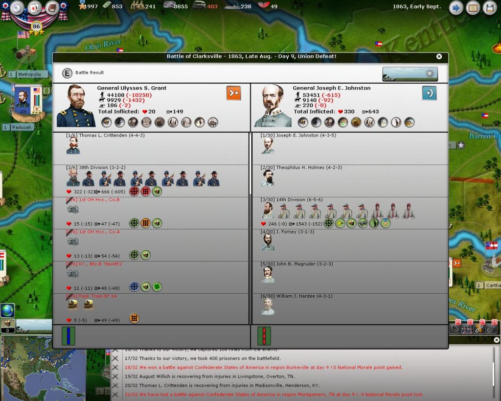 I saw how Grant and Critedden forces entered at the same time on the province, but only Critedden force fought the enemy, as you can see on the next image. All the Union forces that you see on the image was the forces involved on the battle. So the result was a big defeat, 10000 deaths and 8000 prisioners, including 3 big batteries and supplies.
