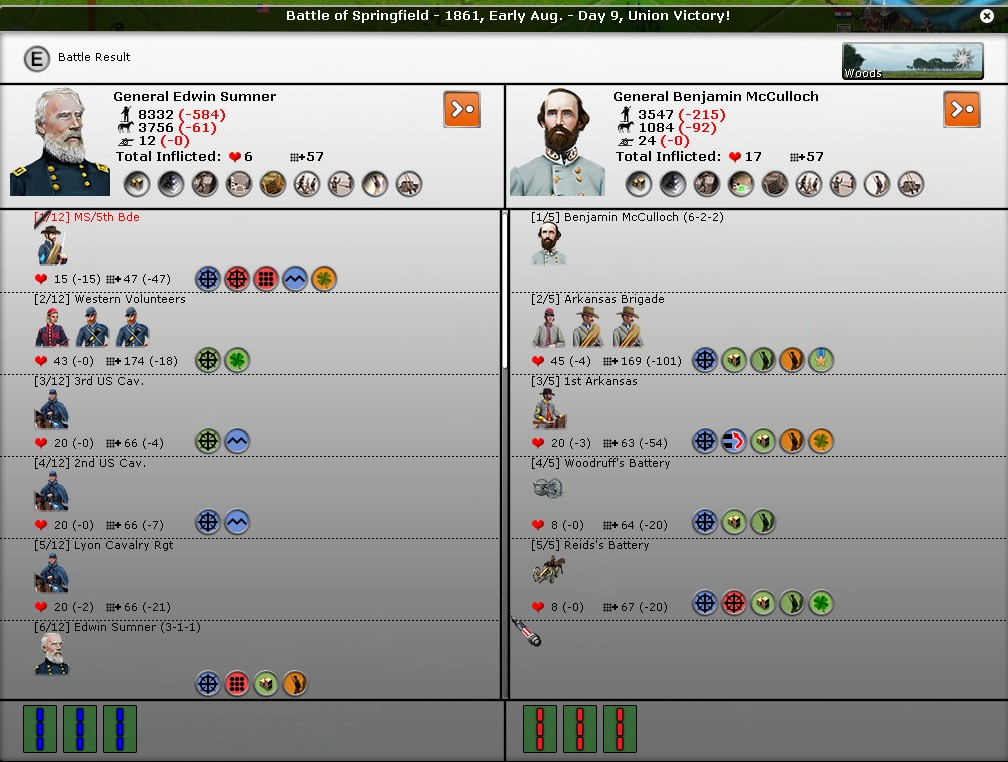 This part did go as planned, although my casualties were higher than expected. The problem is I see Van Dorn with 2 divisions heading for Springfield. I'll have to rush back to reinforce gen Wood with only 1/2 division there. I think the reason why I had higher casualties than him is because of large number of brigades he is having. Each round, my division engages one his brigade, and overwhelms it. At the same time, his multiple brigades get away unharmed. Sort of one giant against a lot of small units type of combat occurring here.