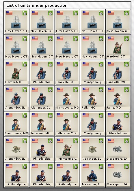 Back in Cairo, Hurlbut is inactive as well, so only 1 division in the McClellan stack. The rest are inside Cairo, together with lots of units still being built.