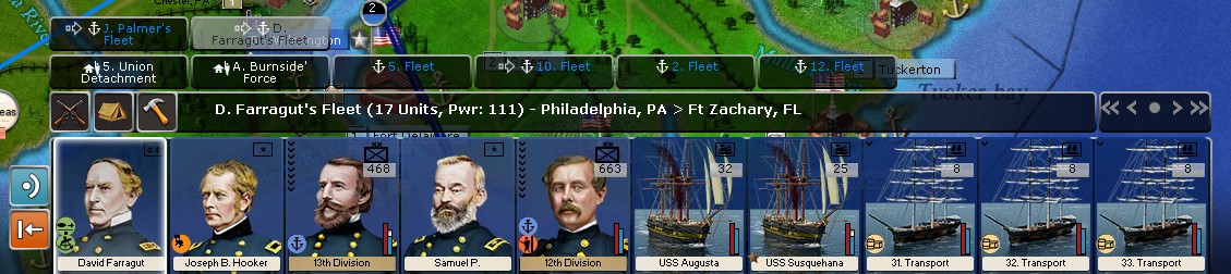 I have boarded ships with more than 3 divisions, 2 division commanded by Hooker are in the Farragut's fleet, and the rest are in Palmer's fleet. I have 2 divisions formed solely of marines and sailors. This is self-imposed HR of mine. No marines in ordinary divisions for amphibious landings.[ATTACH]26623[/ATTACH]