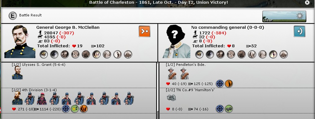 Also converging at this stack is a part of Grant's detachment. It was tempting to order Grant himself to lead the attack, but I do not want to tie Grant permanently to this theater, I need to get him to Tennessee as soon as practicable. So I detached an understrength division from this direction as well and ordered them to intercept the retreating rebels, while Grant with one division is ordered to assist McClellan in his Cairo-Charleston attack.