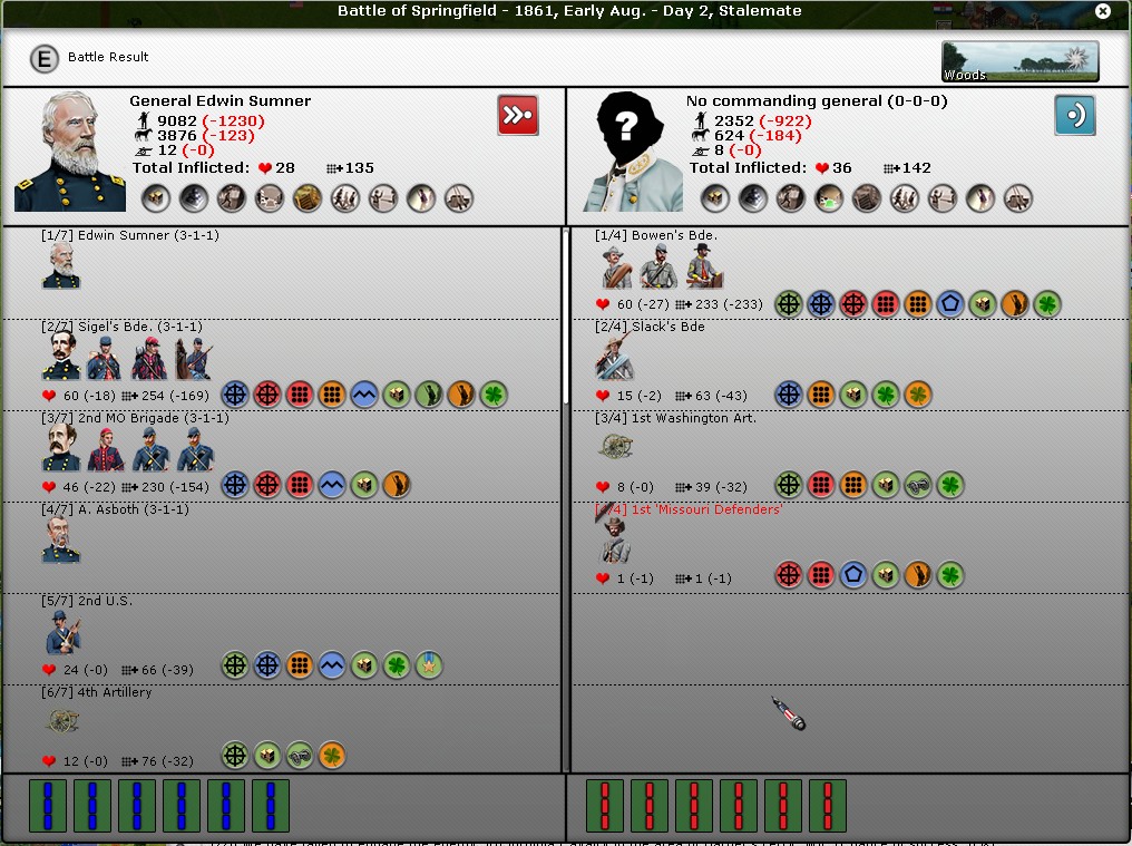 This part did go as planned, although my casualties were higher than expected. The problem is I see Van Dorn with 2 divisions heading for Springfield. I'll have to rush back to reinforce gen Wood with only 1/2 division there. I think the reason why I had higher casualties than him is because of large number of brigades he is having. Each round, my division engages one his brigade, and overwhelms it. At the same time, his multiple brigades get away unharmed. Sort of one giant against a lot of small units type of combat occurring here.