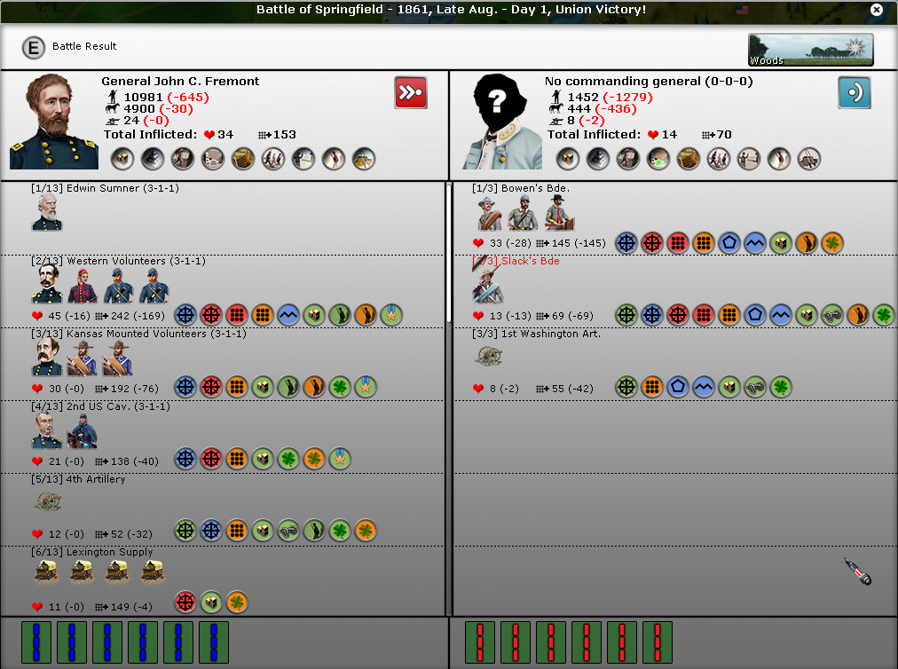 This part did go as planned, although my casualties were higher than expected. The problem is I see Van Dorn with 2 divisions heading for Springfield. I'll have to rush back to reinforce gen Wood with only 1/2 division there. I think the reason why I had higher casualties than him is because of large number of brigades he is having. Each round, my division engages one his brigade, and overwhelms it. At the same time, his multiple brigades get away unharmed. Sort of one giant against a lot of small units type of combat occurring here.
