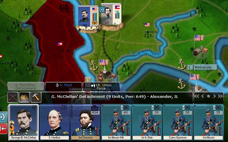 Back in Cairo, Hurlbut is inactive as well, so only 1 division in the McClellan stack. The rest are inside Cairo, together with lots of units still being built.