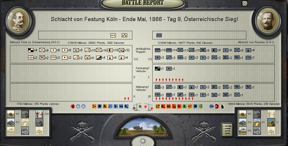 In the east, Prussian troops move about but the Emperor does not wish to advance on them - victory in sight, he sees no gain in slaugthering pressed German peasants and shows mercy and care for those who shall soon be his subjects. Also the siege of Cologne is to be lifted. On all fronts the dust settles and men look forward to years of peace and prosperity under the wise rule of Franz Joseph, father of his peoples.