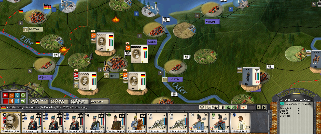 Newly promoted, Franz Freiherr von John is sent to take command of the battered army and lead it from the field to well deserved rest and refit in Rostock, which has to be taken by them first, though. Gablenz is on his way to Berlin where he is to assume command of Schwarzenberg's army, while the army he lead to the great victory of Dresden may now spend a few summer weeks in pleasant Bohemia, with Pilsner beer on the Emperor's expenses and the adoration of Prague's young ladies. Archduke Karl Ferdinand sets out to Stettin to wash away the stains on the Imperial army's reputation with Prussian blood.