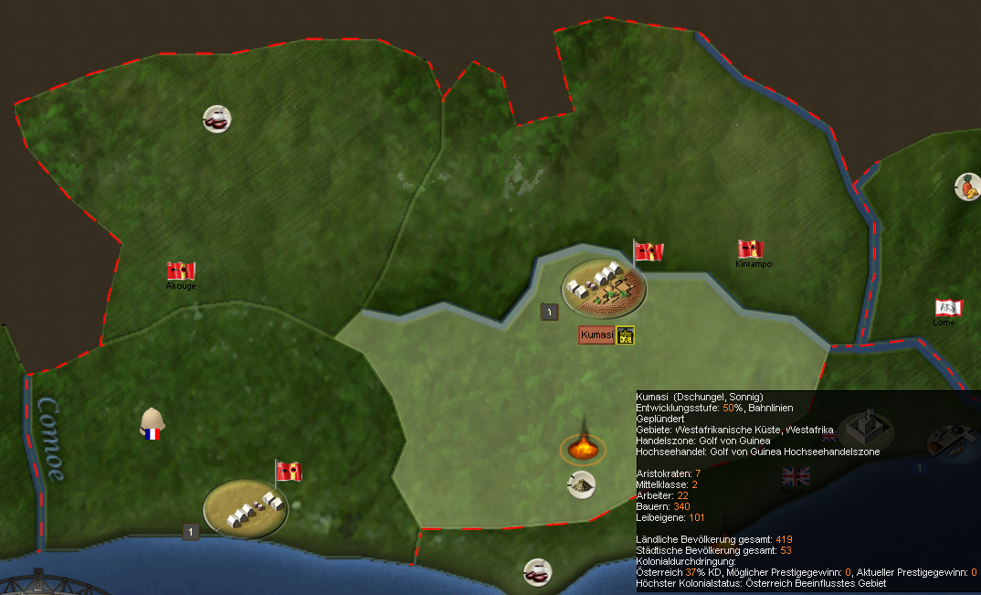 We have now sent military units to help out the police in suppressing social unrest. A diplomat is on his way to Washington DC to offer a defensive treaty. Our colonies are doing nicely, if slowly in their development. A private enterprise has completed the task of building railroads in Ivory Coast, so in spring another expedition will be sent there to finally make it our colony - transport by rail should make this task much easier than the first expedition's. We have recieved reportsd of French colonial actions in the area, but we are not concerned about it.