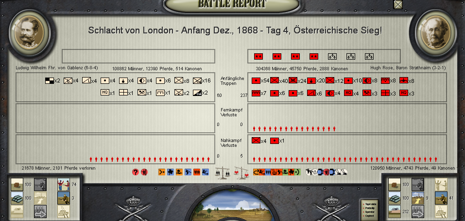 The war with Great Britain started as a colonial war in Ivory Coast where the British Expedition met a very fatal fate. That favor was returned though to a German expedition in which Friedrich Karl von Preußen led some mobilised troops to besiege Malta - only to find an army of regulars stationed there who did not care the least for such visitors. To bring this war to a satisfying end, the Emperor has decreed that London itself must fall, if the Empire is to gain glory (and colonies) from it. And so the hero of the Austro-Prussian war, the Freiherr von Gablenz, sets forth with his army of veterans but also with troops from the German states led by their own officers, thus using the chance to cement comradeship and loyalty between the old hands and the new members of the greater Germany. Gablenz meets the British Home army at London, just before winter sets in: