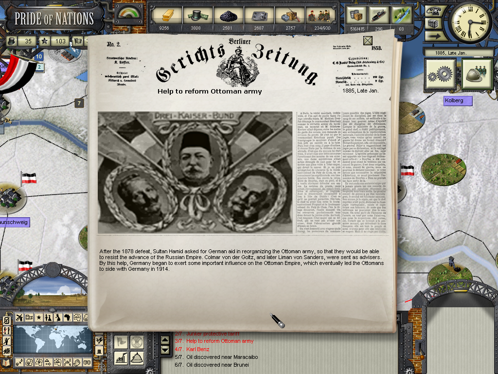 The year of 1884 has ended and the German Empire continued to expand its influence all over the world. We're struggling to keep the balance of power in Europe in our favor by creating closer links with all the contenders and trying to make them trust in our role of arbiter of Europe. Now we are the envy of the world with companies like Bayer, Krupp, Siemens and NDL leading the new industrial developments around the globe, but it seems like the more our power grows the more sour our relations with Great Britain becomes, specially now that Germany entered in the naval race with the british and the french.