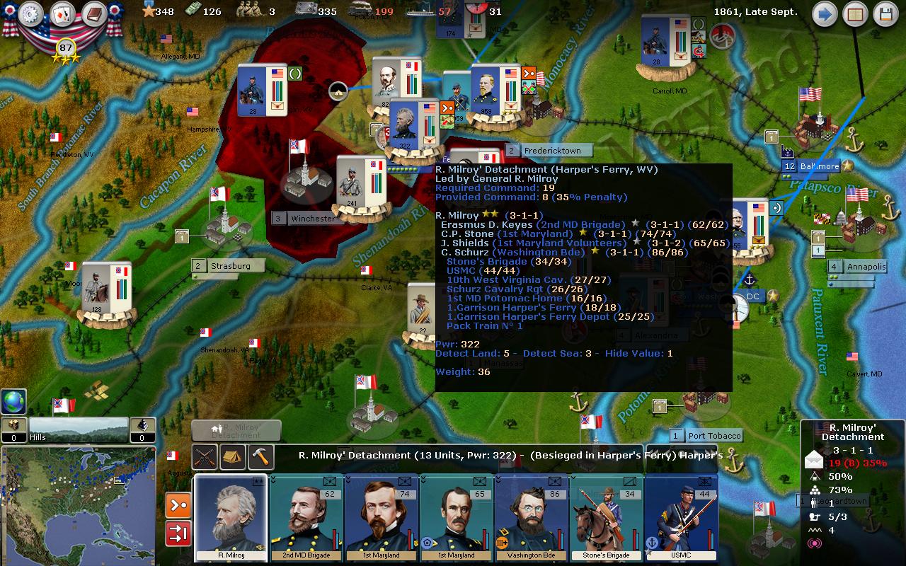 Gray Fox wrote:The nine garrison Divisions are only about 400-500 PWR, but they have supplies and a depot and are entrenched to 4 right now. I have two understrength Cavalry Divisions to counter raiders. I have secured HF. As soon as I get the supply situation fixed, I'll start the next offensive. Lyons and Grant are at HF.