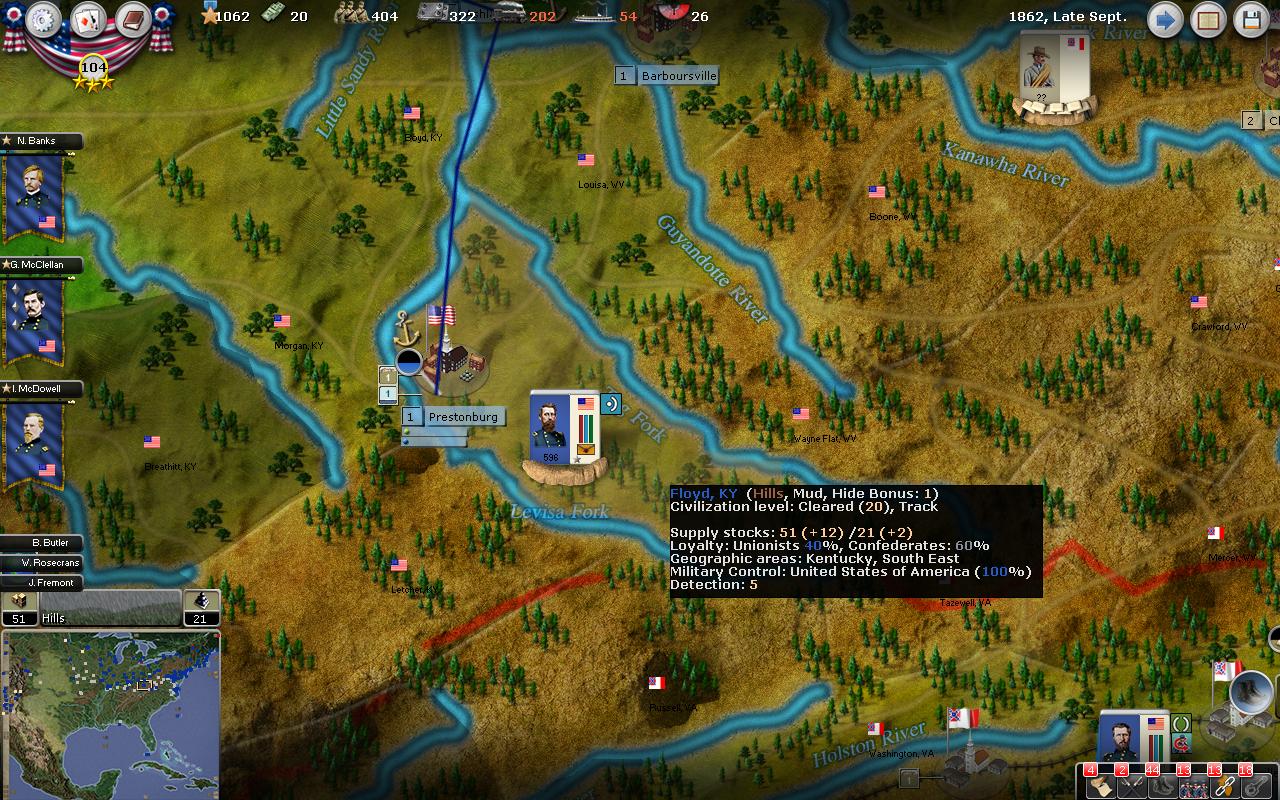 KY has joined the Union in this righteous struggle. I have moved a Division to Prestonburg, KY and built a depot. Two cavalry Divisions of brigade strength based there have slipped through Tazewell, VA in a surprise move to Wythesville, VA. McArthur will twist up every inch of rebel rail he can while Palmer will continue on into NC and torch the depot at Lexington.