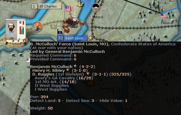 McCulloch has St. Louis under siege. Sumner's defenders had suffered an epedimic last turn, but are now stronger than the rebels. I have moved the reserve Corps to relieve the siege.