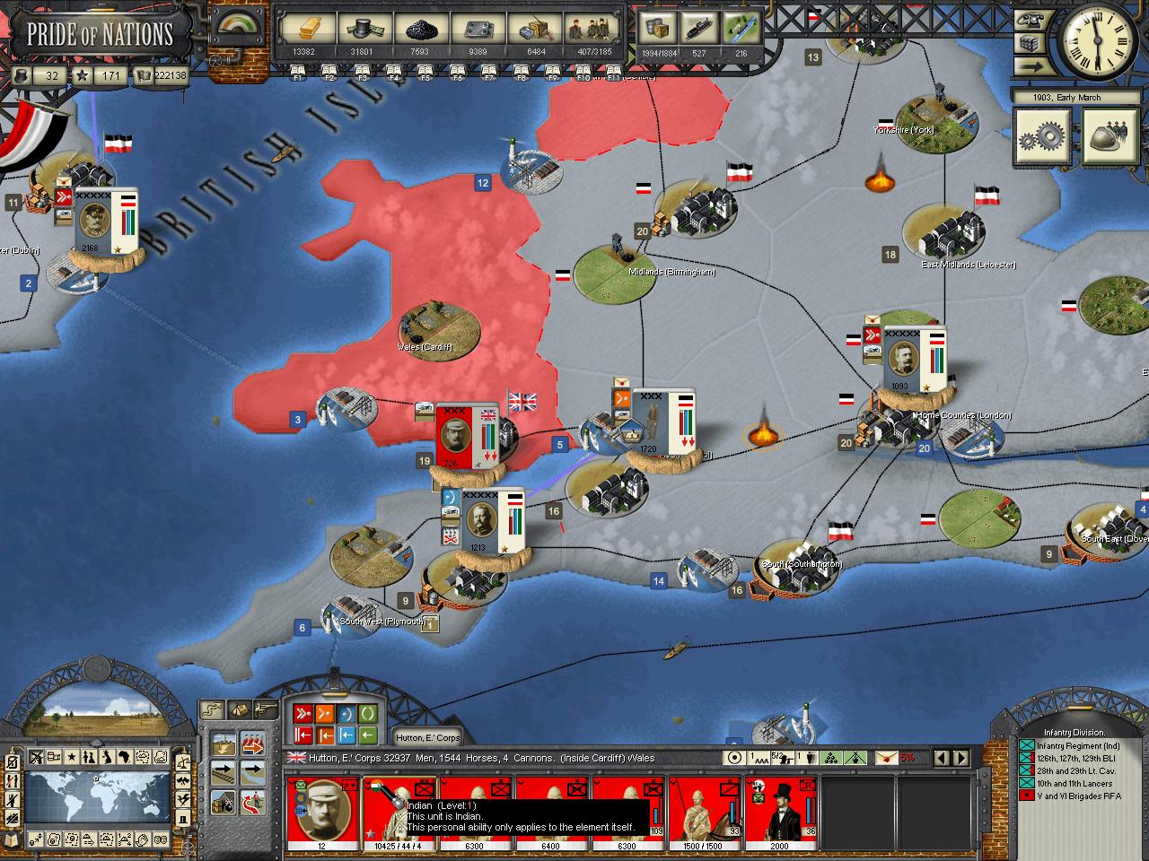 Well thank you for such a comprehensive response, but I said that because the unit wasn't there before, Wales was conquered, but it revolted an an army spawned (without the indian brigade as I was controlling what forces the enemy was garrisoning there) and then later on the brigade came to reinforce the defenses of Wales, by the way I speak so assured of these things because I'm playing with "focus on move" turned on, so I saw in the message board during the pass turn phase many messages of transports coming and going from some regions, it seems the british have a right of passage in Iceland as many transports came and go from there.