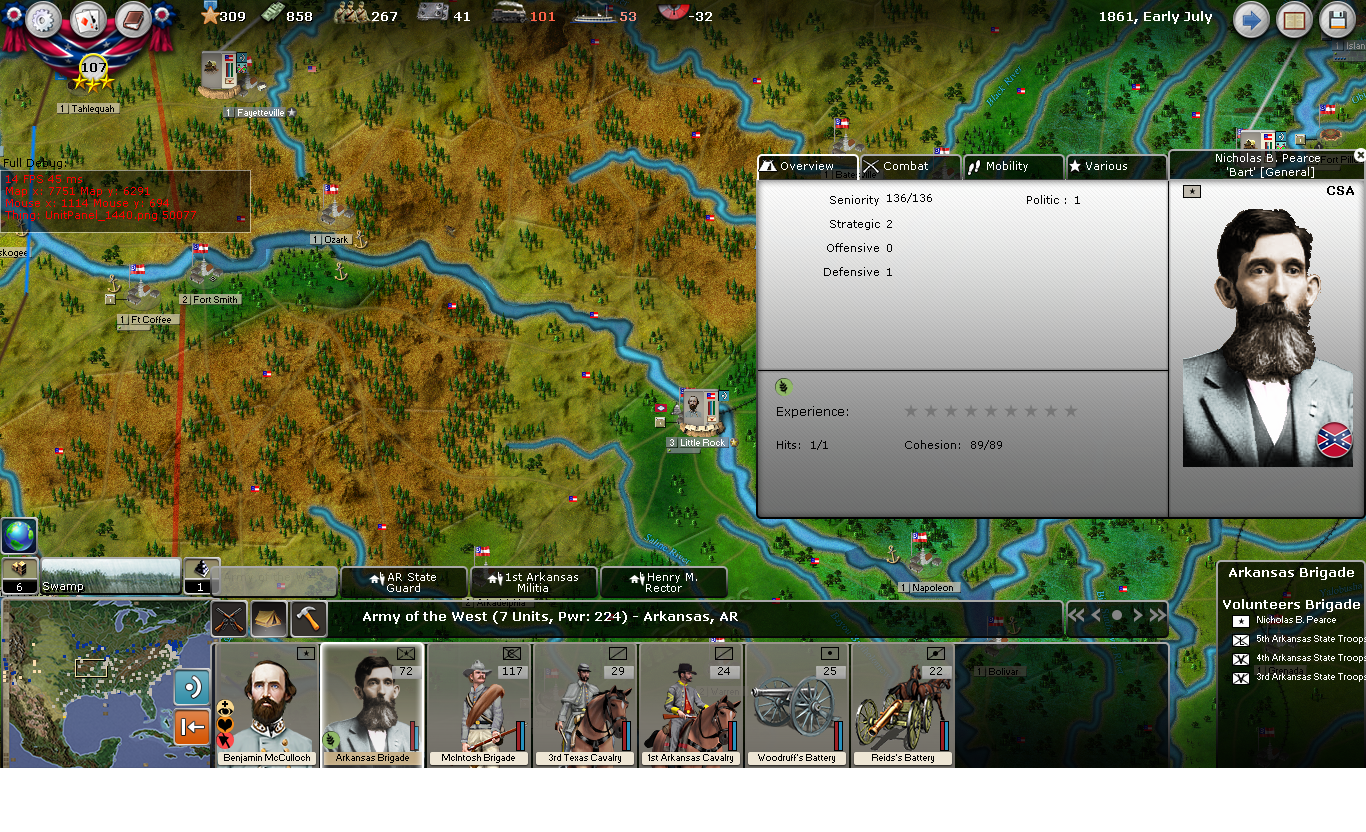 In July, McCulloch and Pearce of the Army of the West unlock. Again, the brigades are slightly bigger and the regiment names tweaked for accuracy. Also, to reduce the command strain of the larger brigades throughout the map, I've given each army one new General early in the game. For the USA, I've added the hero of Fort Donelson, Charles F. Smith. For the CSA, that means Pearce. He looks very nice here, I'll be sending him towards Fayetteville.