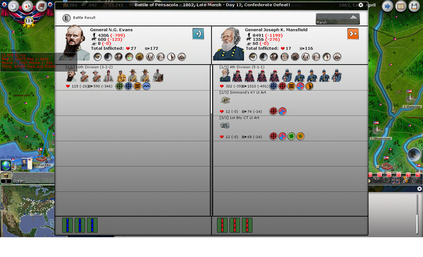 On February 28th, I felt a bit overeager and attacked Fort Pickens with General Evans. I won the battle, but lost more men (276 versus 184) and didn't capture the fort.