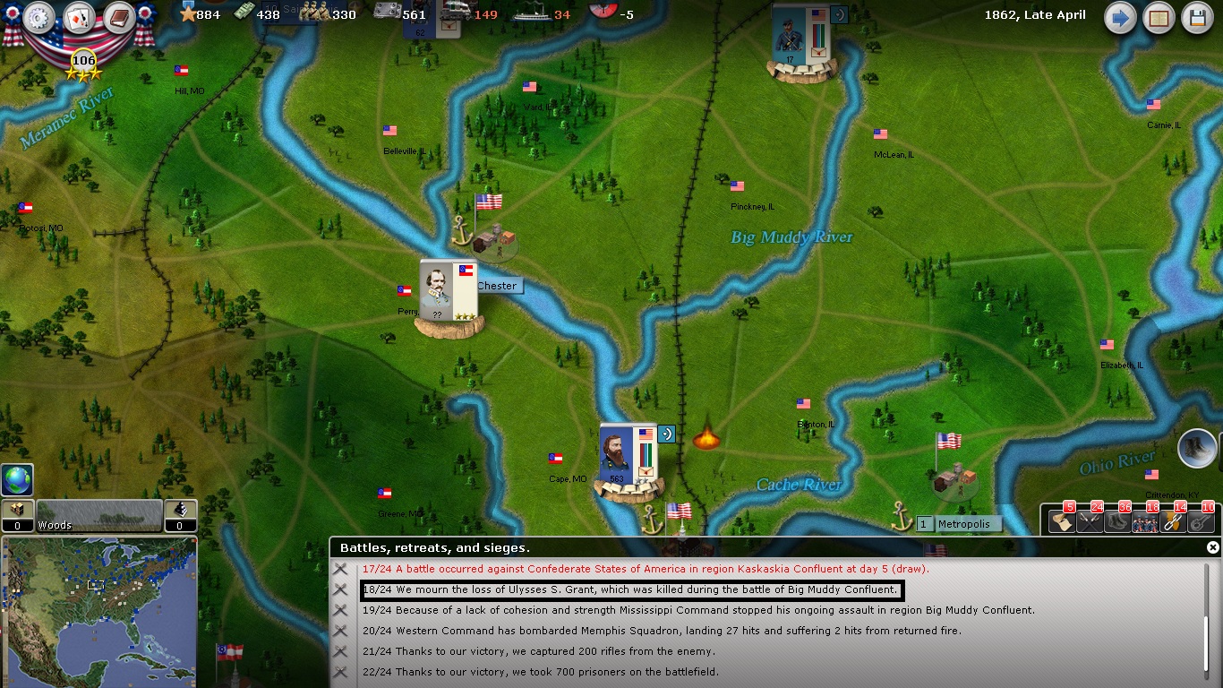 Seraphim wrote:He was not killed in battle : the battle of Kaskaskia before and the bombardment of Western Command (near Saint Louis) after are different things. Grant and his troop are not involved.