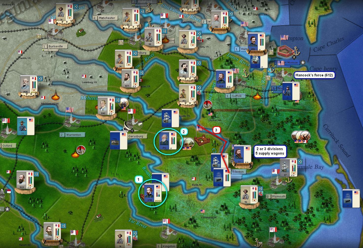 4) Chowan river is in my control. I may expect an attack from the fleet in Albermal sound (power = 94) but I'll try to stay there as long as possible to cut the supply from Norfolk/Edenton.
