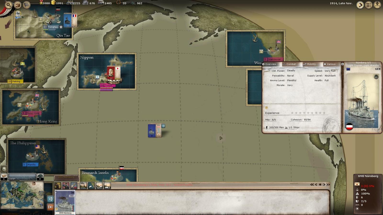 I haven't really mentioned my (ever disappearing) German cruisers out on the oceans creating trouble for the Entente. Here is SMS Nurnberg very much at the end of her capabilities, but still managing to sink merchant shipping, according to the news I received.
