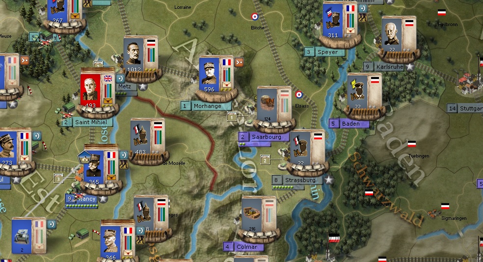 Nothing much happened. I did take Morhange. But there weren't any troops there, so no battle. I would think the troops in Metz would be getting a little nervous by now. Their supply is a little tenuous since it comes through hilly terrain and the troops protecting their rear lines don't seem that strong. If I take Saarbourge and Vosges, they ought to be out of supply. At the very least they'll be surrounded.