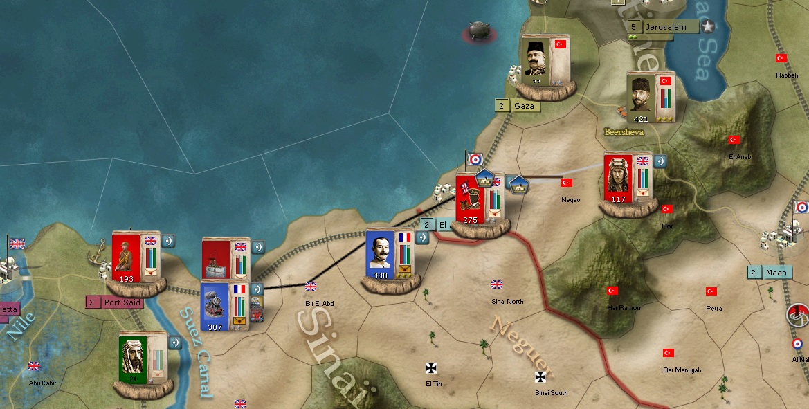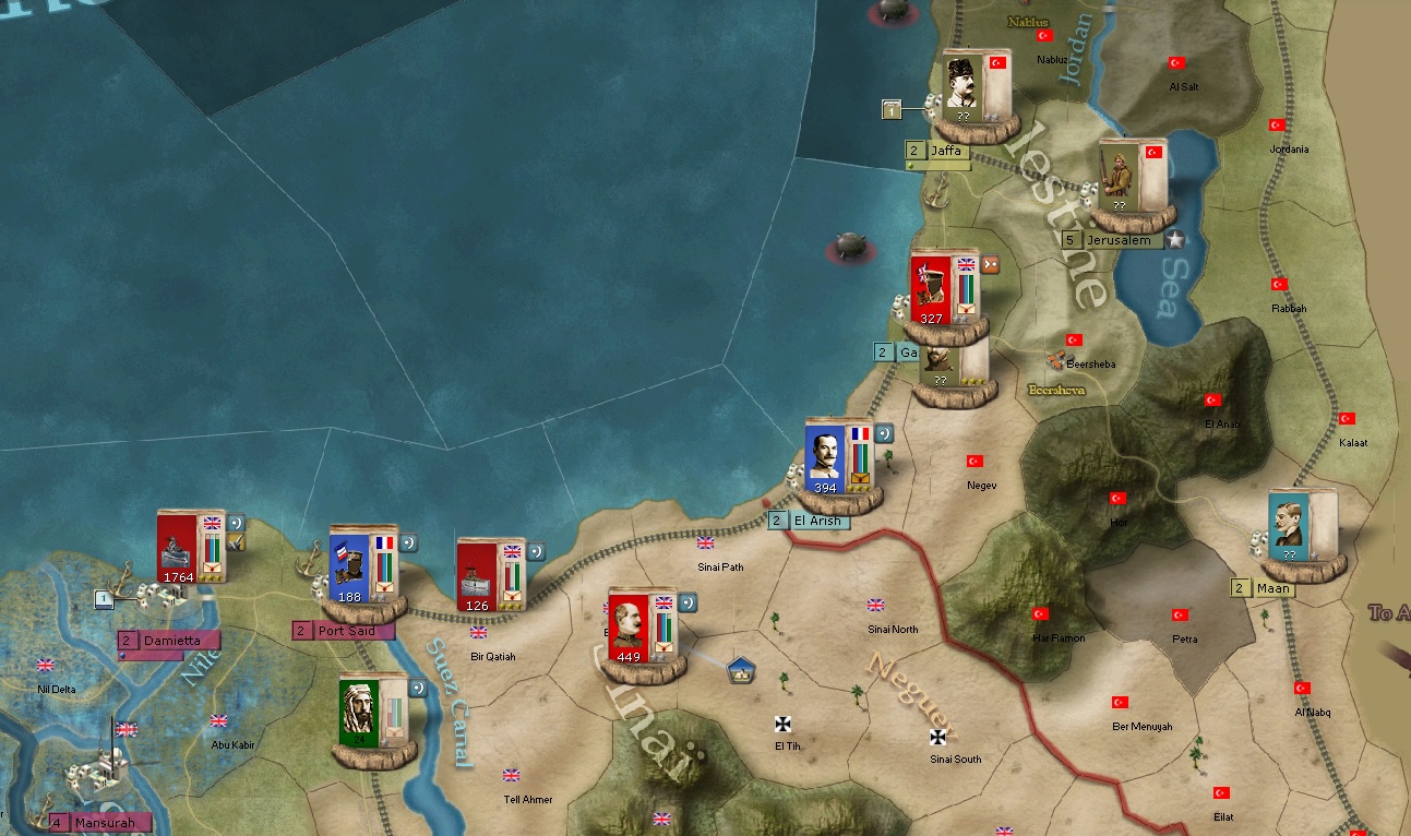 In the Egypt theater, it looks like the Turks are withdrawing somewhat. They are certainly not pressing the issue and I have basically an unbroken line covering all advances South/SouthWest into Egypt. I'm wondering if I should pull a historical move and go SE to Aqaba on the Gulf of Aqaba.