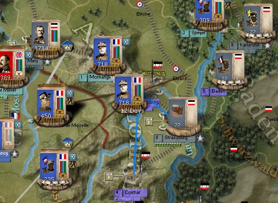 And I am going to move Castelnau SE and try and take Saarbourg. The only formation that could truly threaten Morhange is the 1700+ formation in Metz, and I don't think he's abandoning Metz any time soon. If he did, I would feel like that was a mistake giving up the fortification/entrenchment at the Fort of Metz, so yeah, he'll probably stay put.