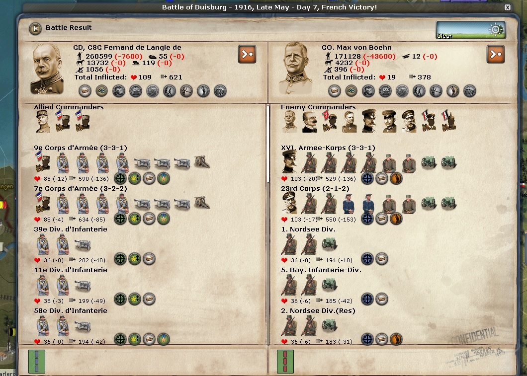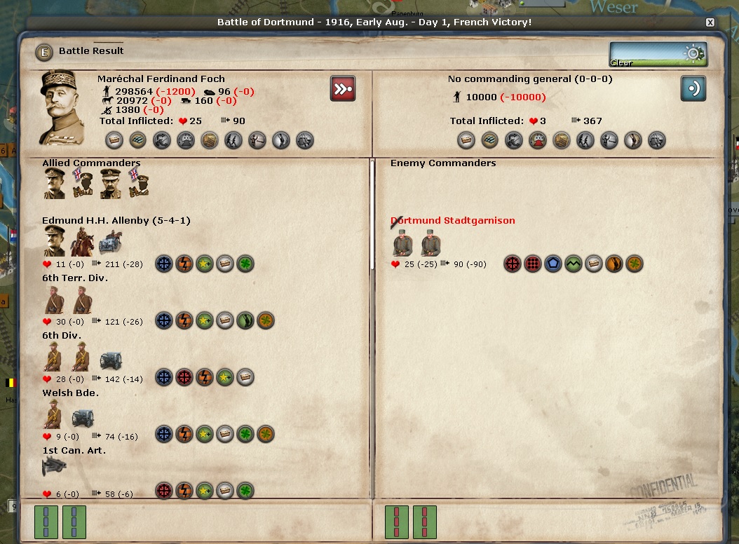 Assault on Koeln - major victory. I finally received some NM for a land battle. I am sure it is because I completely eliminated all these elements. I received 2 NM for this won. Good job, Monsieur Foch!!