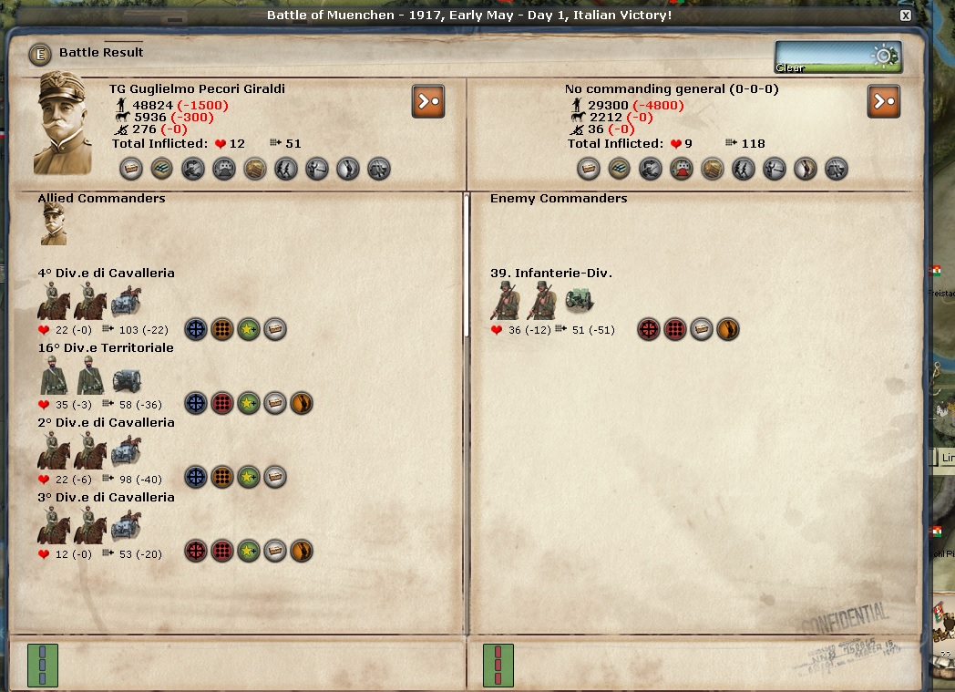 H Gilmer3 wrote:I lost a little more. But yeah, you would think it would have been a slaughter. My general was on defensive and retreated after 1 round. The losses were actually 2900 for me and 1650 for him. closer to 2 to 1 losses, if you count the horses. I'm not sure if that is just horses or mounted troops. I have always assumed they were mounted troops. He lost no mounted troops.