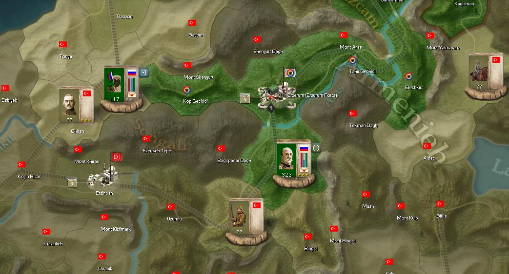 In the south, my troops are slowed down by muddy hills just off of Erzurum, and Turks quickly reinforce that area, making any further advances questionable.
