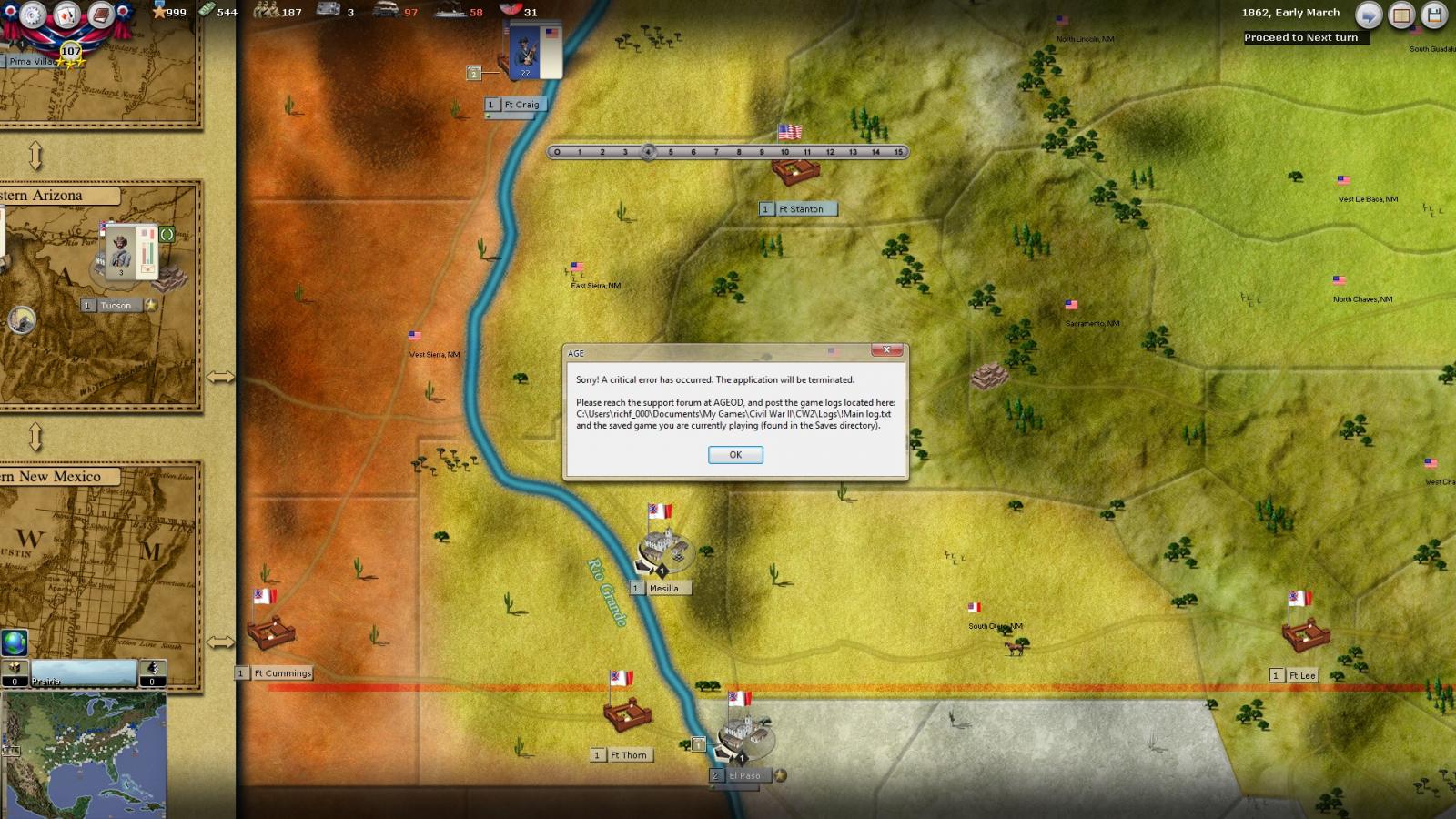 This seems to happen almost exclusively during most 1862 turns. It has happened in every game I have started with he official 1.04 patch. The error appear during the AI phase, but when I click OK it continues on until just before the days start to play out. Reloading the game usually, but not always [then I need to restart multiple times], resumes at that point. Save & log provided.